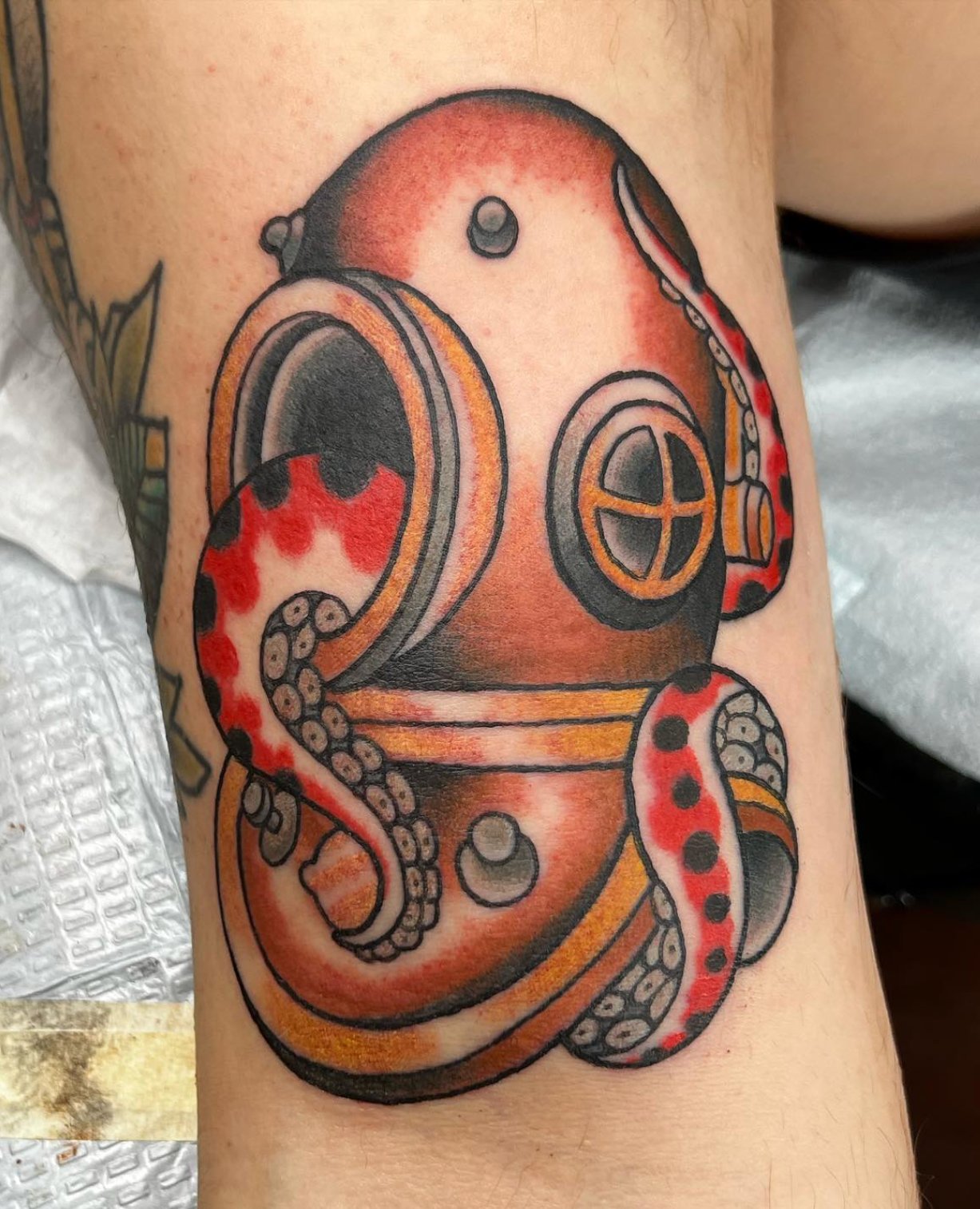 American Traditional Diver Tattoo - These symbols are used to express an. Web result american traditional tattoos can be defined by their use of bold lines and bright colors. Web result characteristics and styles of american traditional tattoos. Step into the classic world of american. American traditional tattoos feature a range of symbols.