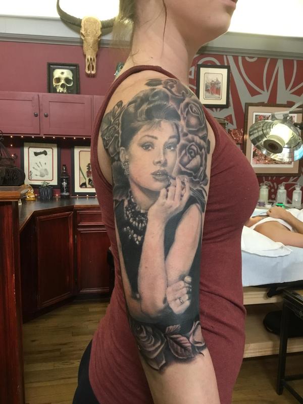 Audrey Hepburn Breakfast at Tiffany's in progress by Edward Lott TattooNOW