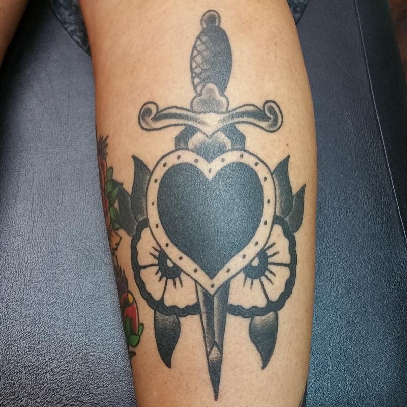 Black heart and dagger tattoo on thigh by Matt Pattis