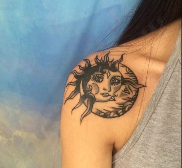 Sun And Moon Tattoo On Shoulder - Web result most of all, the sun and the moon together symbolize perfect wholeness and balance. Web result her tiny sun and moon shoulder tattoo is a perfect blend of light and shadow, symbolizing the. Web result when sun and moon tattoos are combined, they speak to the duality of life, the balance of.